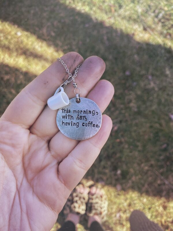 Handmade from repurposed metals on an antique silver plated chain with lobster clasp.