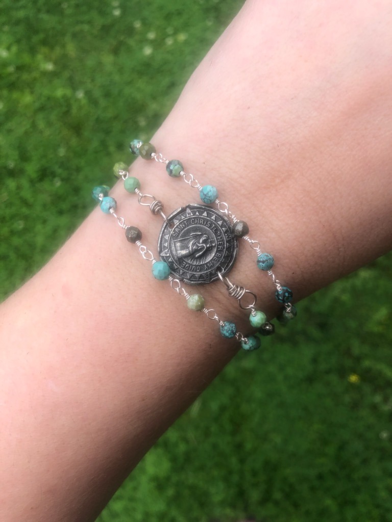 Saint Christopher Rosary Wrap, The Patron Saint of Travelers, made from an antiqued silver medallion and genuine African Turquoise gemstone rosary style band with Adjustable and Lobster clasp closure.